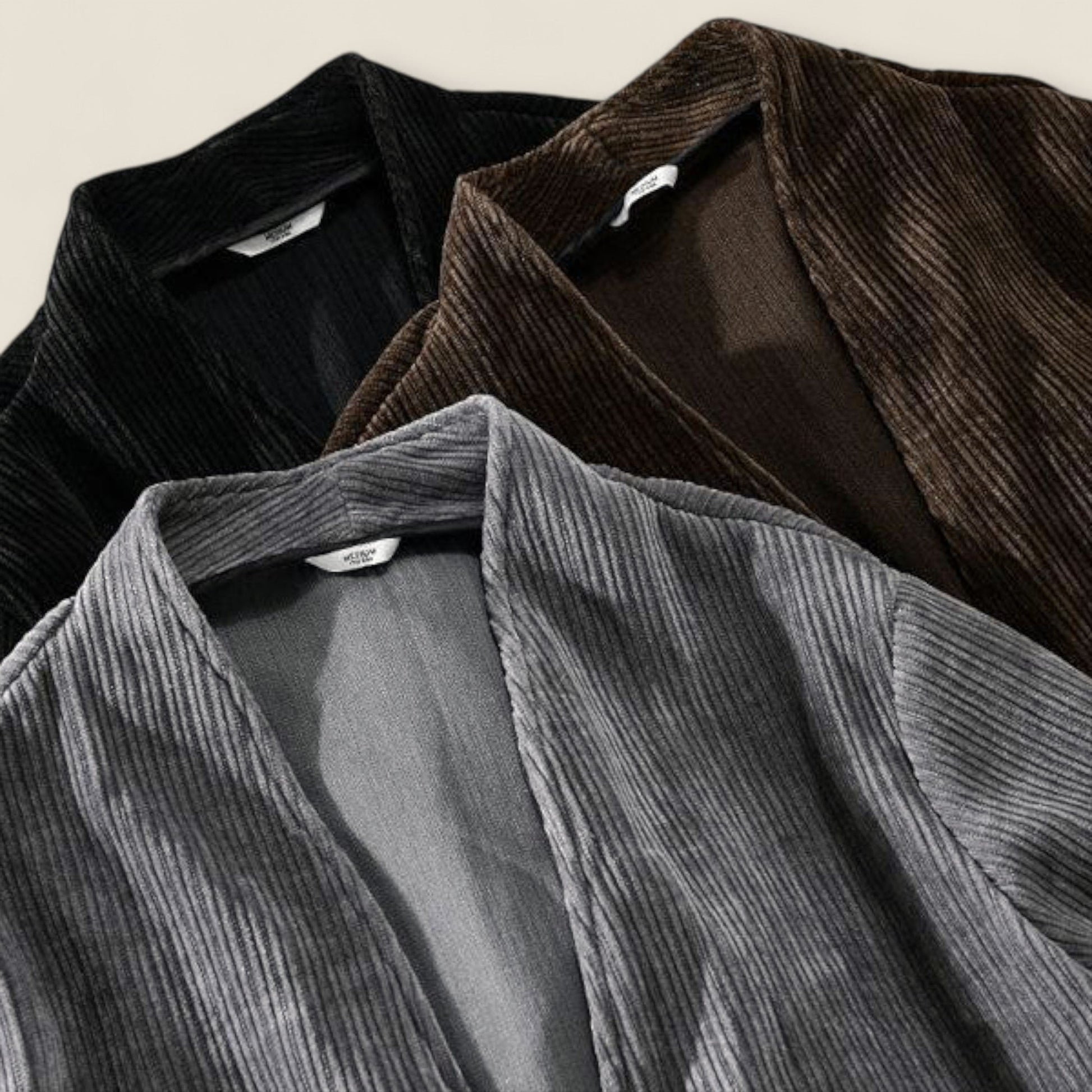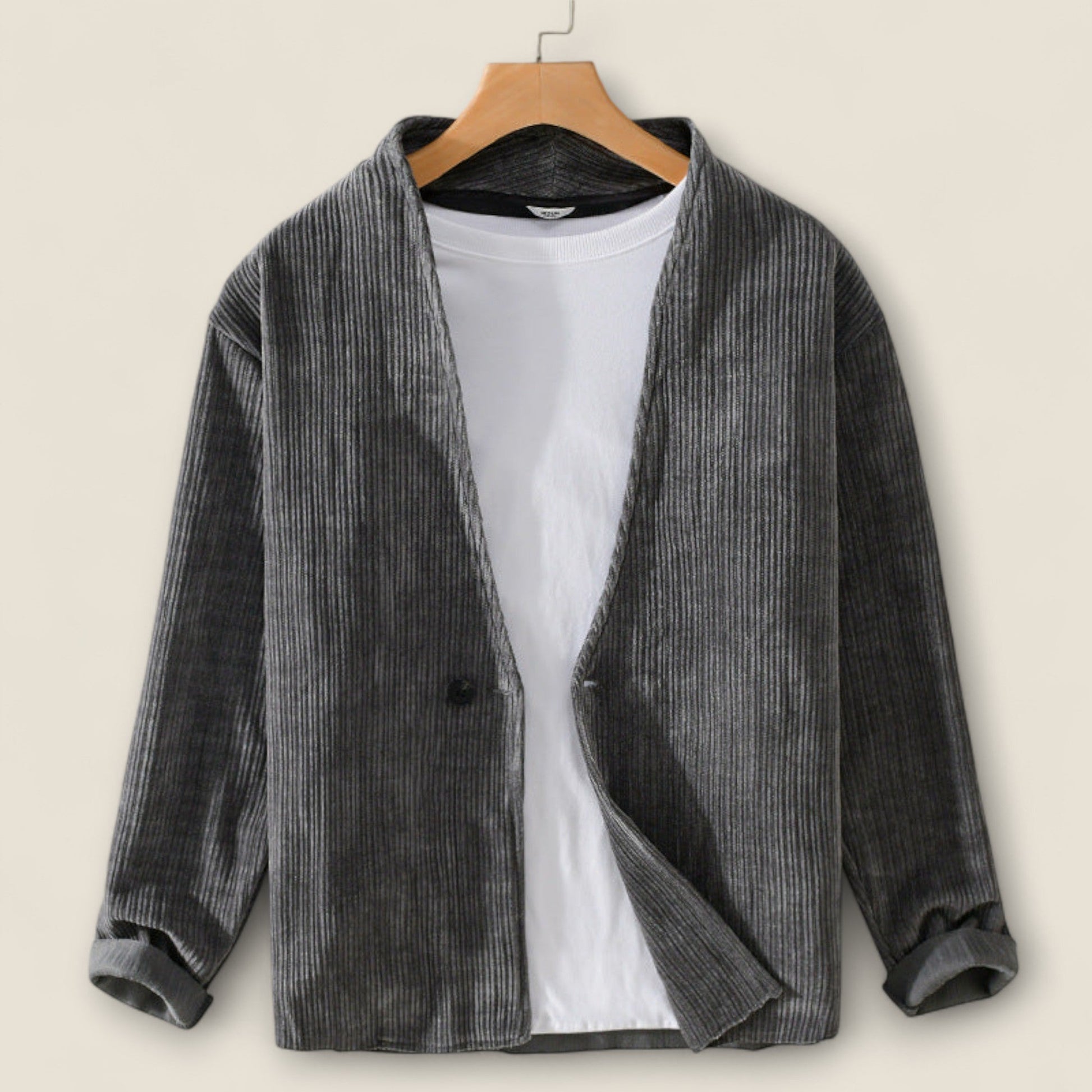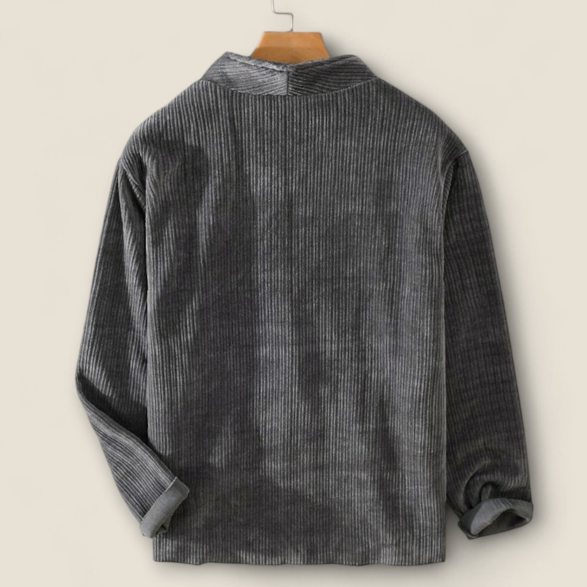 Oplev ultimativ komfort med vores fine-wale bomuldsfløjl skjorte, designet til at ligge blødt mod din hud, mens den bevarer en ren, ustruktureret silhuet. Den kravefrie åbning og lav enkeltknap lukning skaber en strømlinet front, der lader stoffets unikke vertikale tekstur skinne igennem.